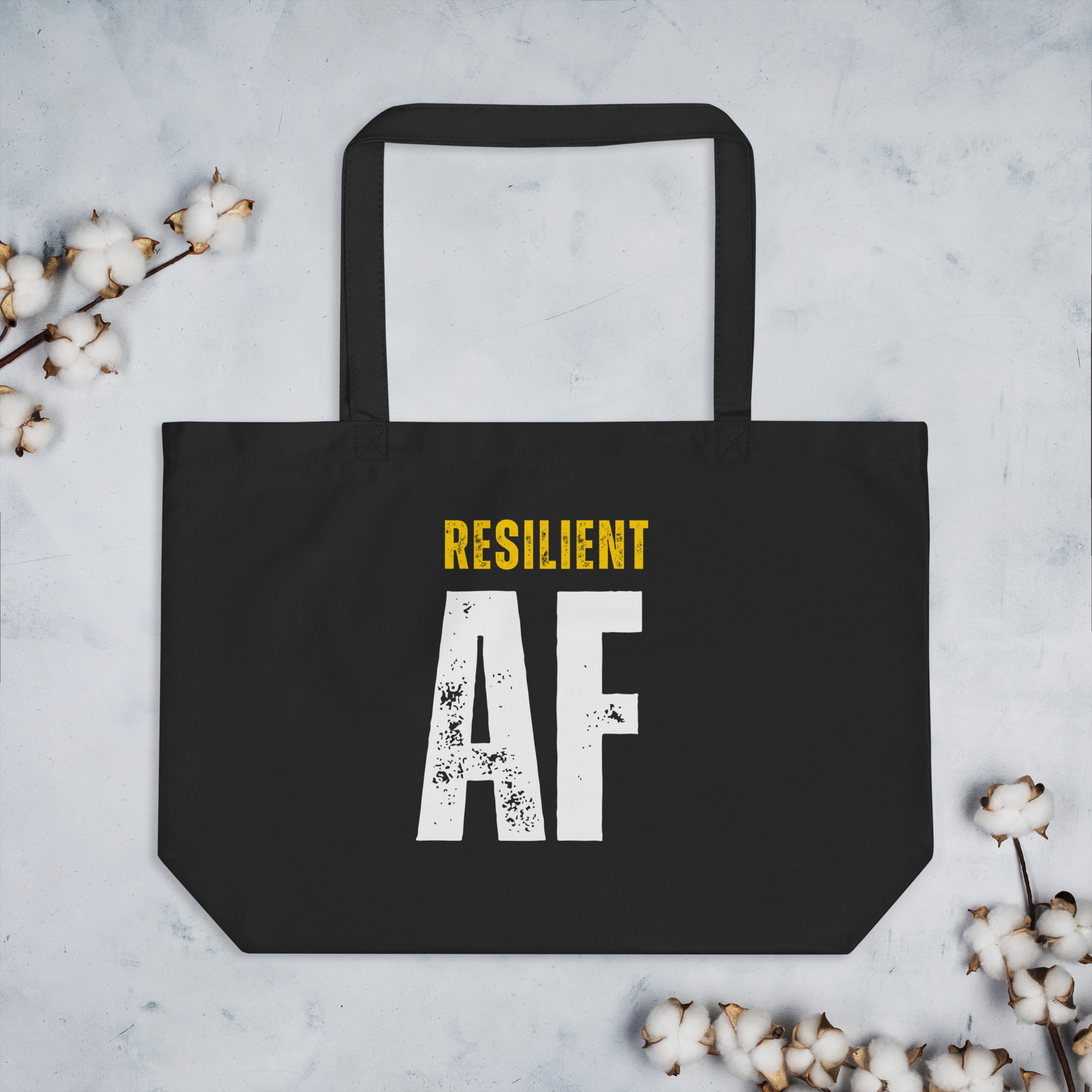 Resilient AF is your bold statement on the go. Made from 100% certified organic cotton, this spacious tote ditches the plastic and holds everything—groceries, books, gym gear, travel essentials. Eco-friendly, durable, and built to carry it all—just like you.